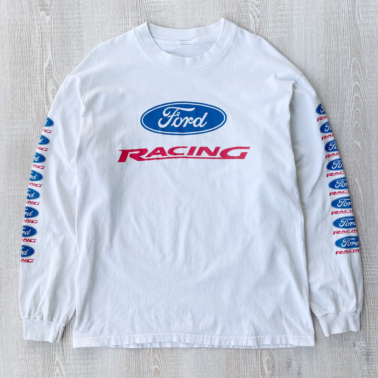 このフォードのロンT、ロゴがカッコいいのは言うまでもなく、袖プリントがめちゃアホっぽくてカッコいいんです。フォードのロンTのフロントにはフォードレーシングのプリント